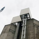 A steel staircase fixed to the wall of the newly designed silo at a height of 55 m. It is the crossing between the new silo and the existing silo.