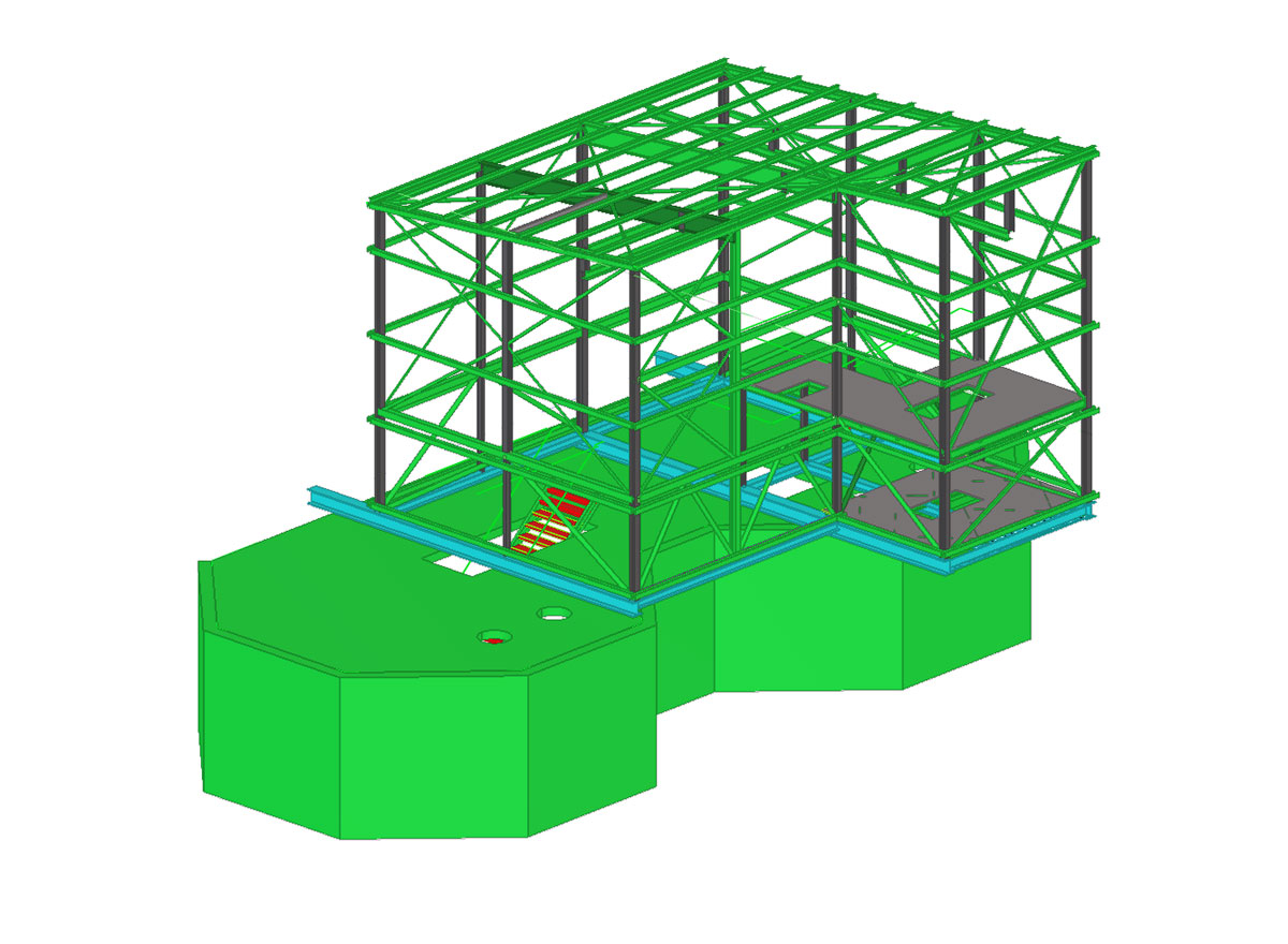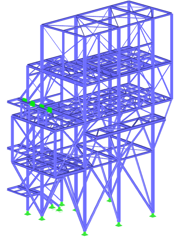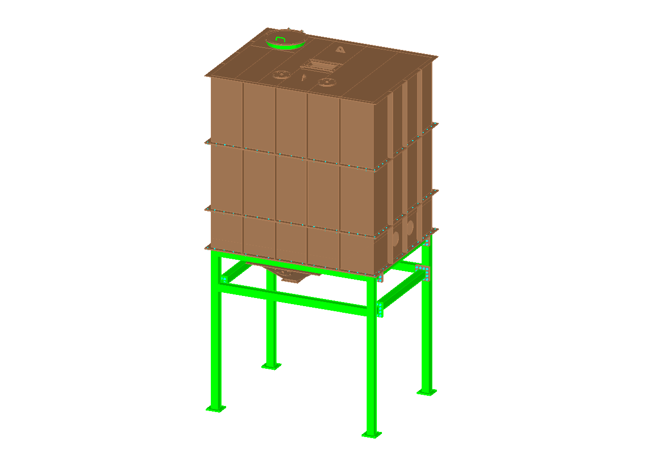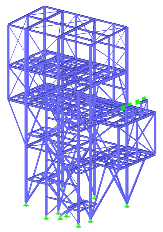 Steel support structure for the newly designed silo with a capacity of V=225m3. The silo is supported on 4 columns. Additionally, three platforms were designed in the structure to connect it with the existing buildings.