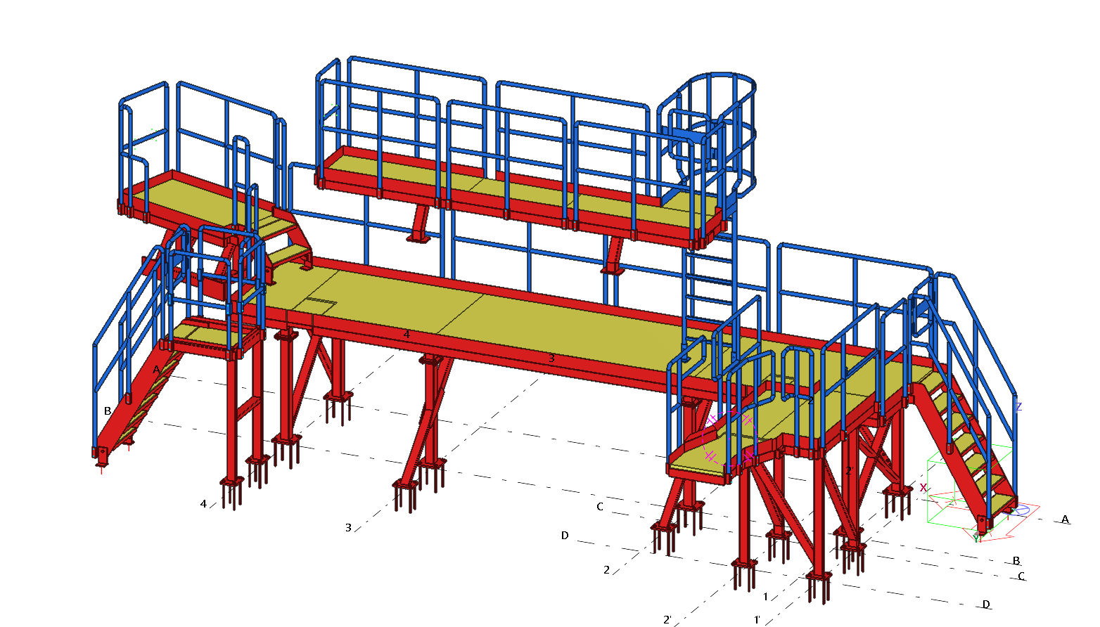 Steel working platforms in chemical plants together with a staircase. The platforms provide support for equipment and industrial installations.