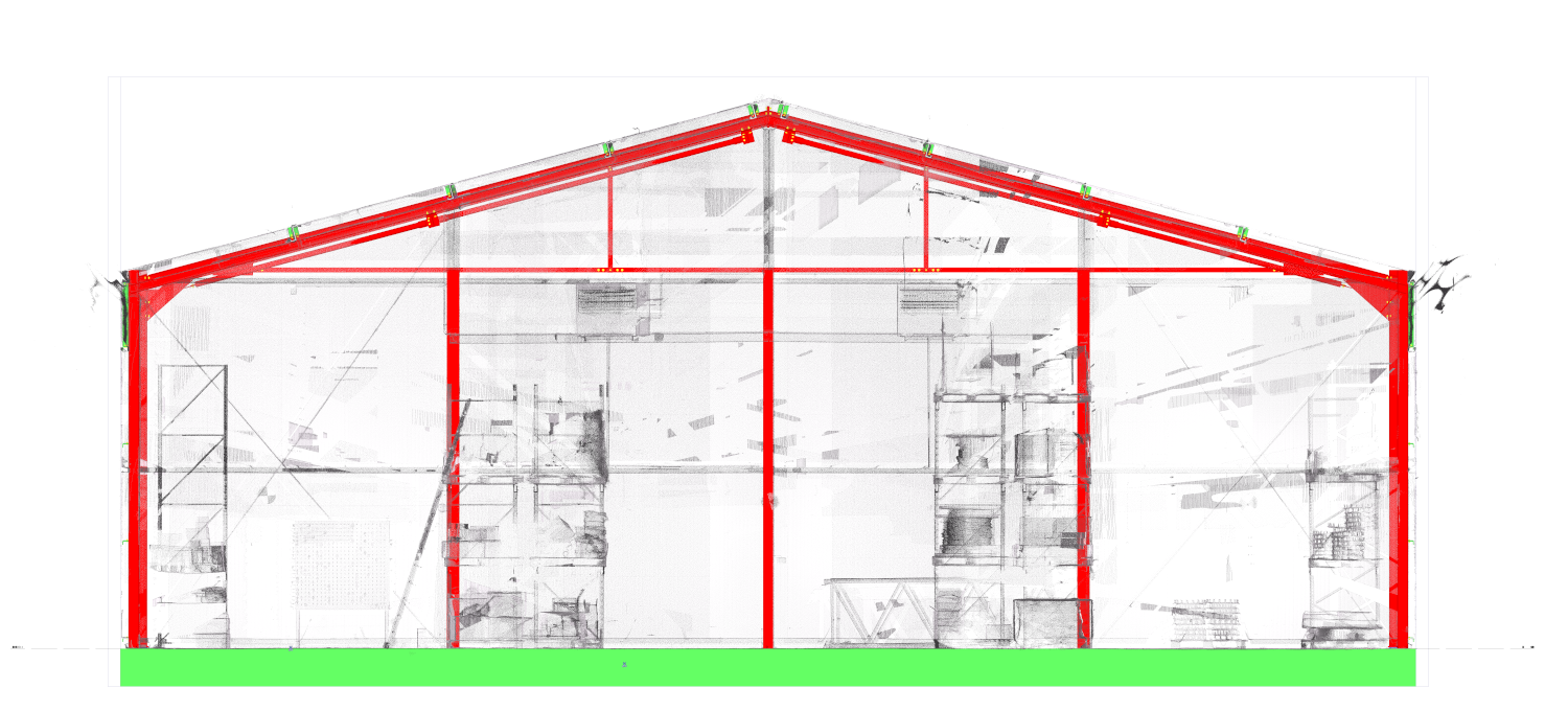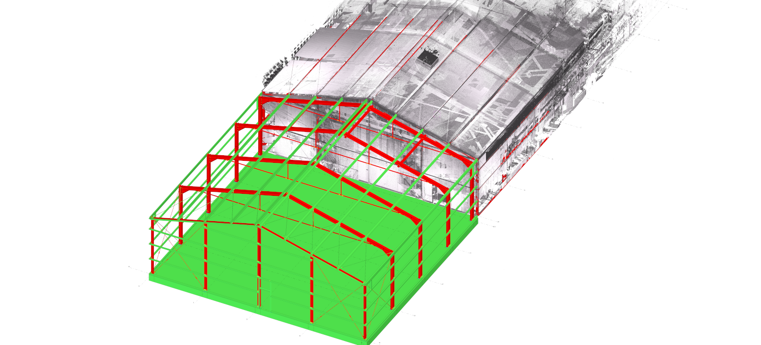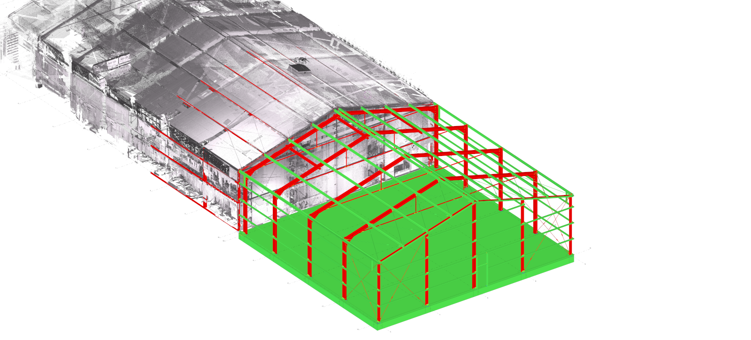 Extension of a single-bay warehouse hall. Connection of new part of the hall to the existing building was made on the basis of geometry obtained from 3D scans and local measurements of the existing building.