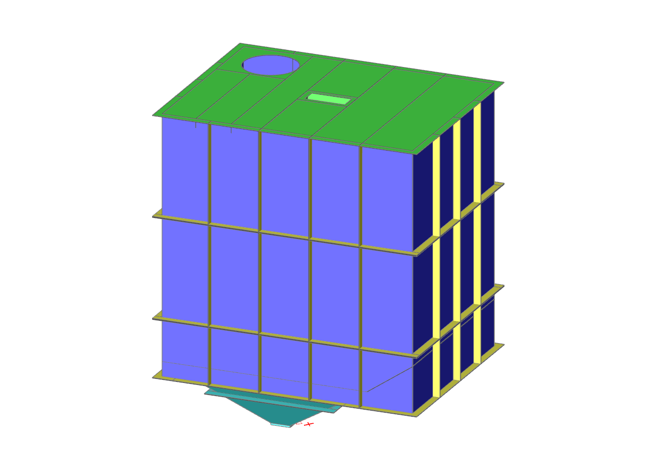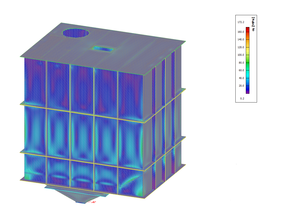Silo for food products made of stainless steel with substructure. Silo is based on four columns made of closed profiles, which are frame structures. Volume of silo is V = 20m3.