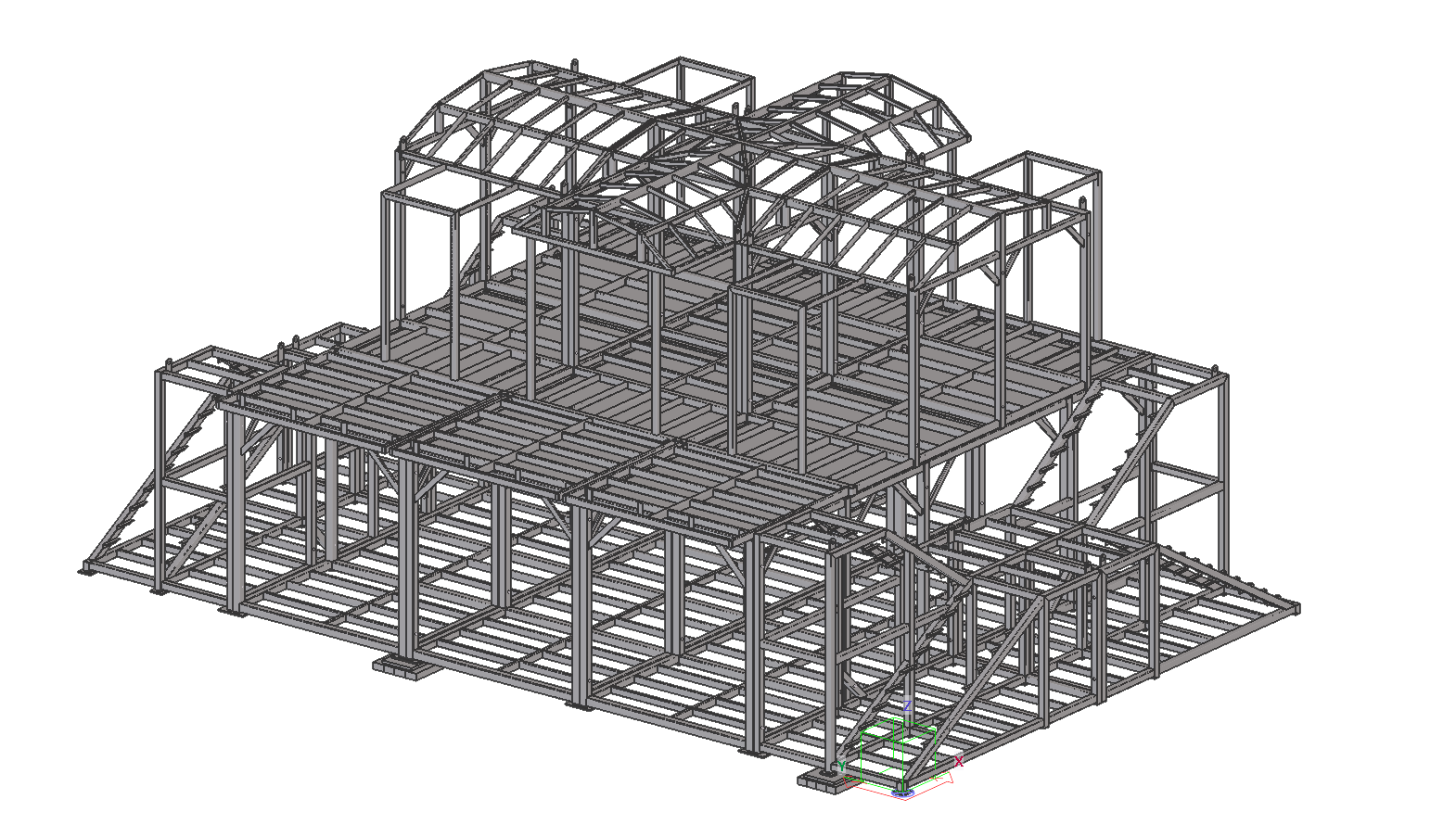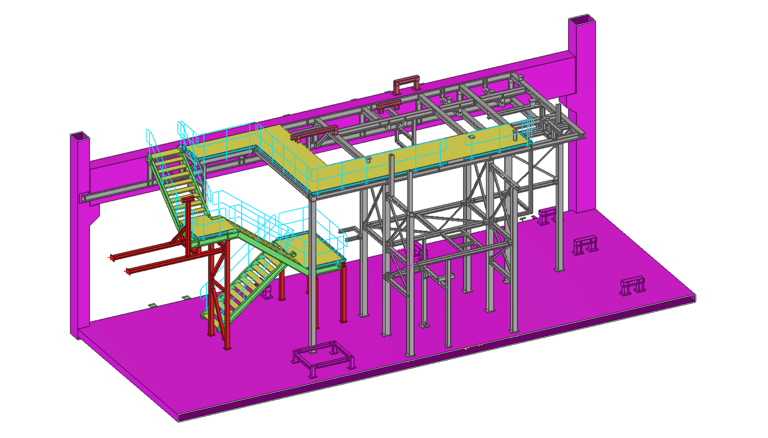 Steel working platforms in the machine room building together with a staircase. The platforms provide support for equipment and industrial installations.