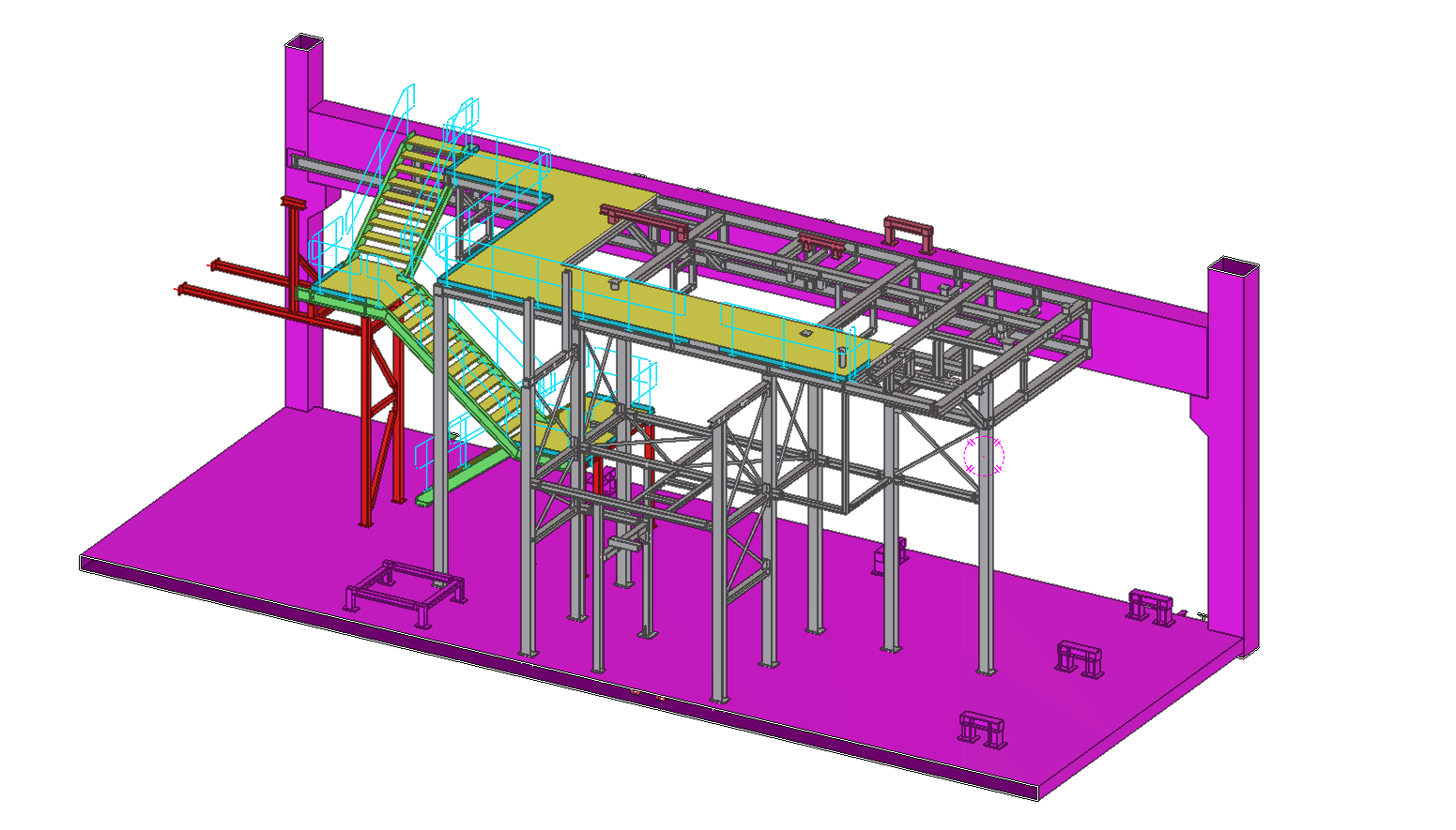 Supporting structure for the mobile device dosing the material for production. Additionally, the structures was equipped with 2 crane beams for servicing the technological equipment.