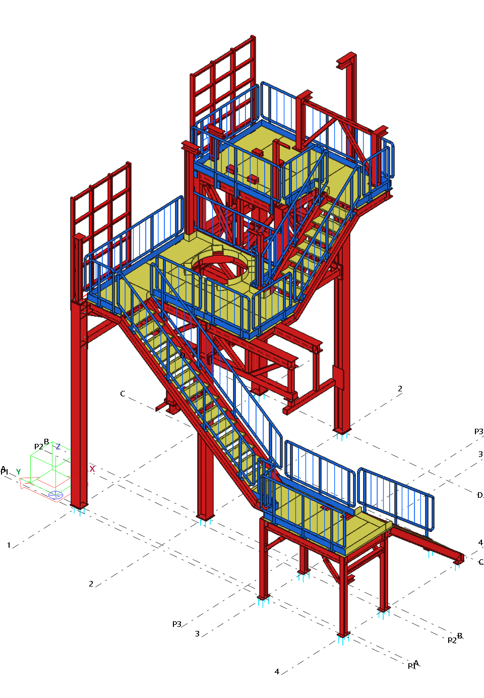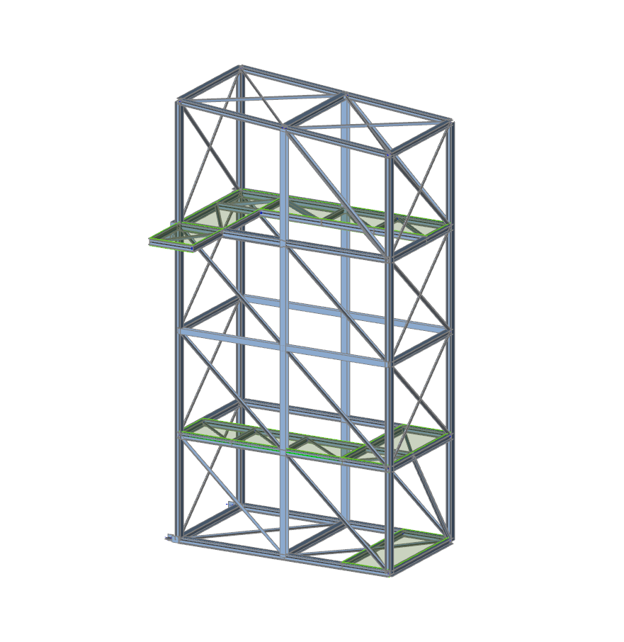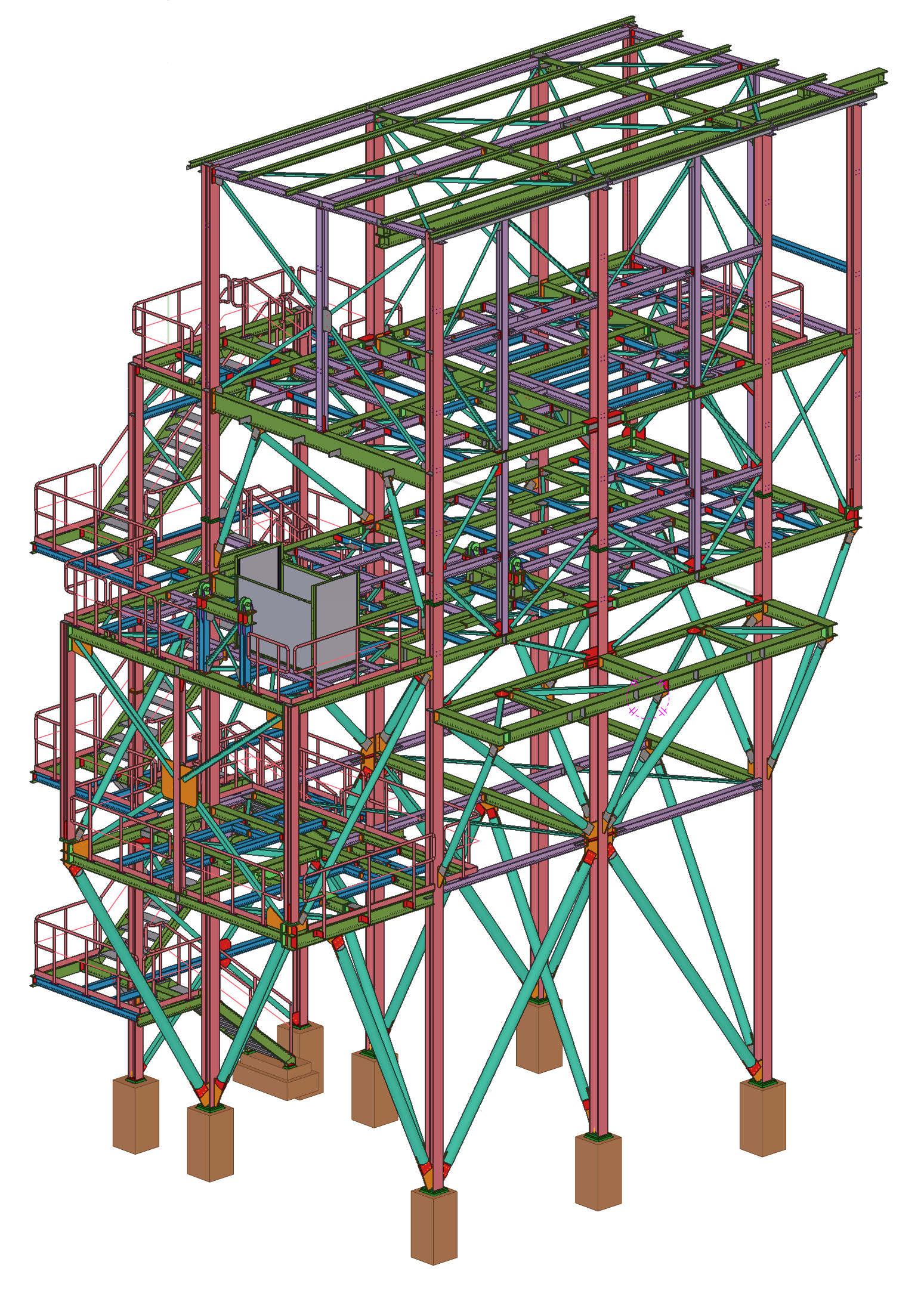 A corner transfer tower with a staircase within the newly designed process line. The tower provides support for the conveyor belt unit together with equipment and process installations.