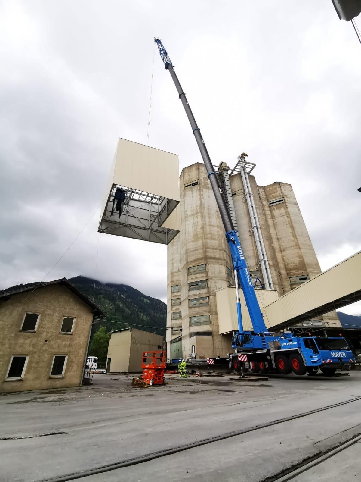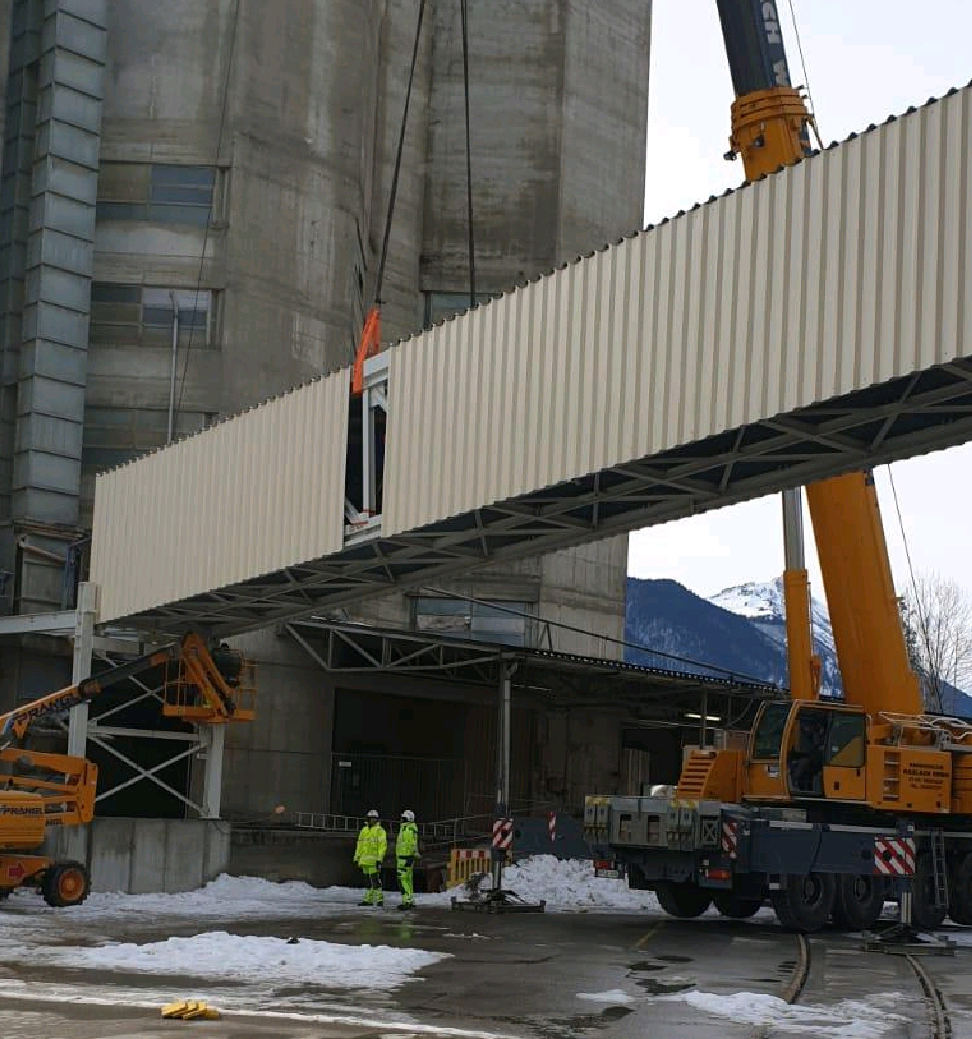 The bucket conveyor building was placed on a pre-engineered steel floor, located on the roof of a 45m high silo. Already at the design stage, the assembly of the fully assembled building on the silo roof was foreseen.