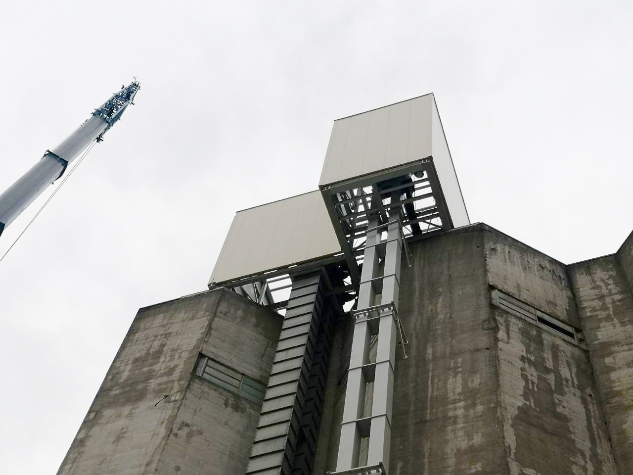 A steel staircase fixed to the wall of the newly designed silo at a height of 55 m. It is the crossing between the new silo and the existing silo.