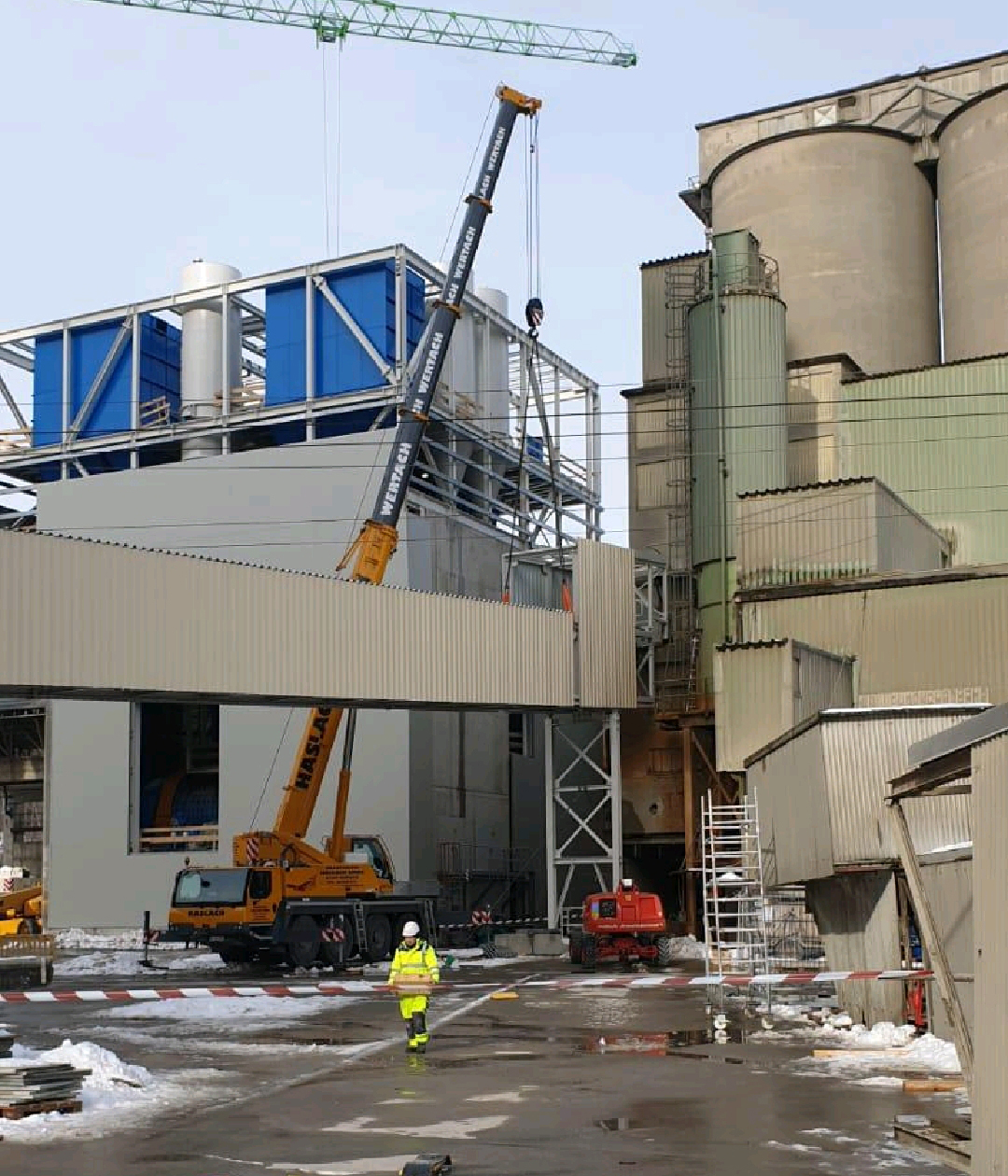 Supporting structure for the mobile device dosing the material for production. Additionally, the structures was equipped with 2 crane beams for servicing the technological equipment.